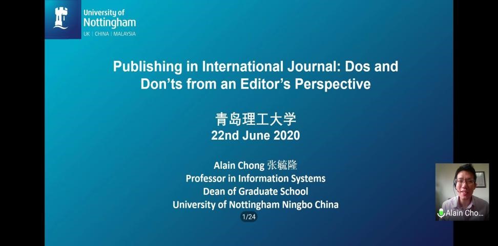 6月23日下午,beat365亚洲体育官方网站举办西海岸商学论坛弘商讲堂(第14讲)学术(线上)讲座。本次讲座邀请宁波诺丁汉大学研究生院经理、博士生导师张毓隆教授担任主讲,宣讲主题为“国际期刊出版的应做与不应做”。beat365亚洲体育官方网站副经理云乐鑫教授及校内外师生聆听本次讲座,电子商务教研室朱文龙副教授主持本次讲座。