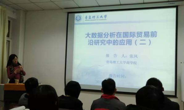 随后,张凤副教授展开宣讲。先对国际贸易前沿使用大数据分析的理论背景进行了阐述,随后,对国际贸易前沿使用大数据分析进行了举例。张凤副教授强调,在国际贸易前沿使用大数据分析,类似的实证研究成果很多,着重梳理并阐述了新贸易理论的两条基本研究思路。最后,对国际贸易前沿使用大数据分析进行了举例,强调了文献梳理的重要性,侧重介绍了论文的研究内容、毗邻效应测度、样本选择等。讲座中,老师们渊博的知识、灵动的语言都给beat365亚洲体育官方网站师生留下了深刻印象。最后进行了师生间的问答环节,解答了同学们的有关疑问。