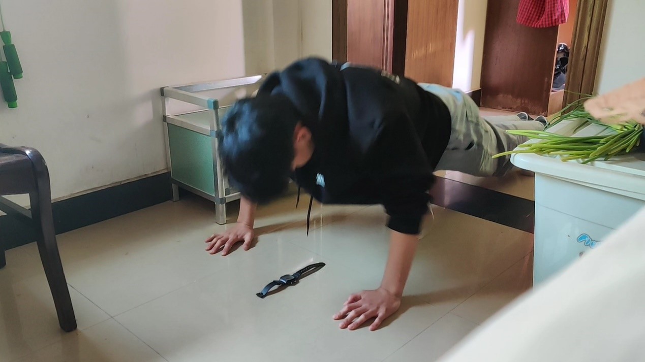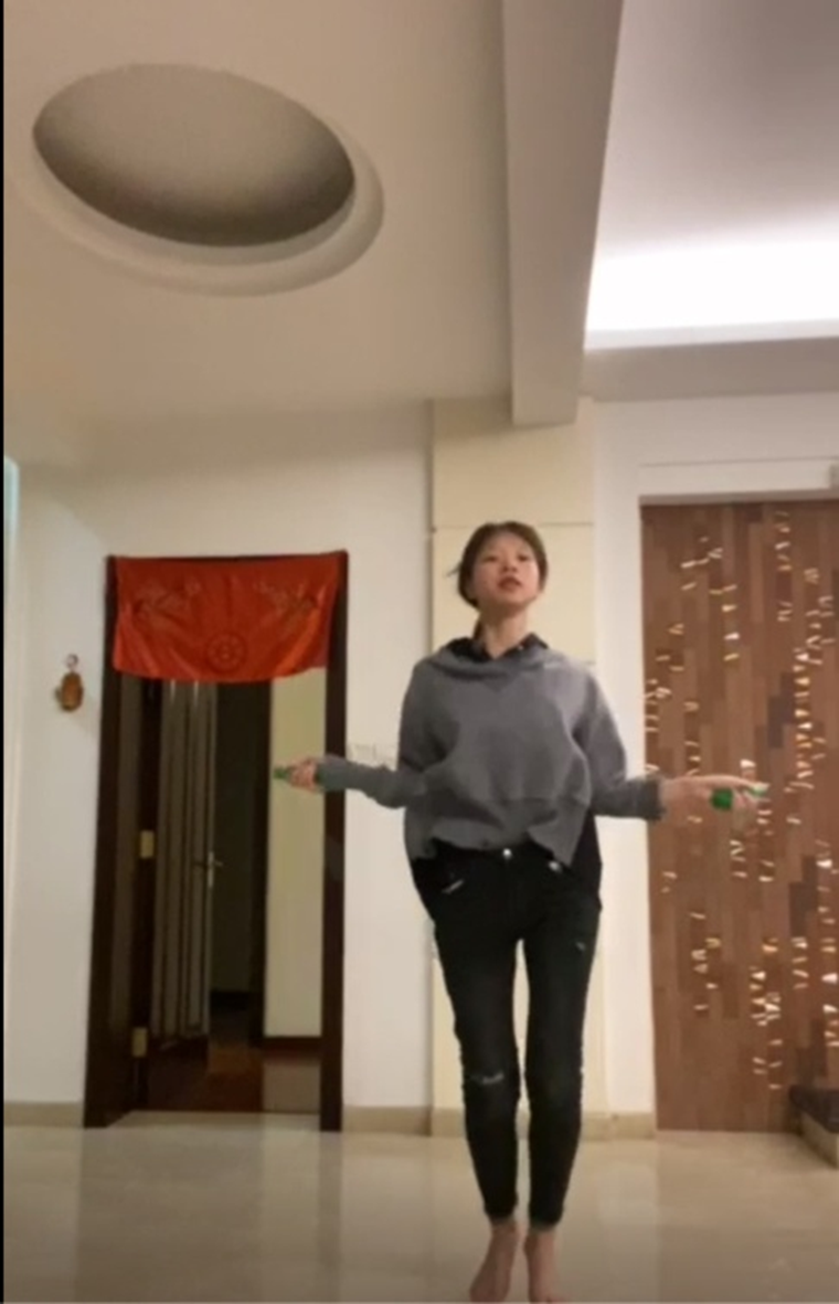 一张瑜伽垫一铺,标准的仰卧起坐准备姿势已经就绪,伴随着一声开始,仰卧起坐的个数在不断增加;一副跳绳一副手套,热身已经完成,伴随着脚尖离地又着地的嗒嗒声,跳绳的个数正在飞速上涨。本次线上运动会共持续十五天,分为男子组和女子组两个大类,均为适合居家日常活动的体育项目。男子组项目包括俯卧撑和颠乒乓球,女子组项目包括仰卧起坐和跳绳。参赛同学需要根据自身的实际情况和喜好选择相应项目,在限定时间内完成该项目的数目最多即为优胜者。昔日在校园里活跃的运动健将们纷纷发挥自己的聪明才智将自家的卧室、客厅改造成了一个小小的居家竞技场。线下“加油”变成了线上“喝彩”。在同学们发来的参赛视频中时常能见到家人们的身影,他们纷纷化身计时员和计数员,共同参与到这次的线上运动会中。