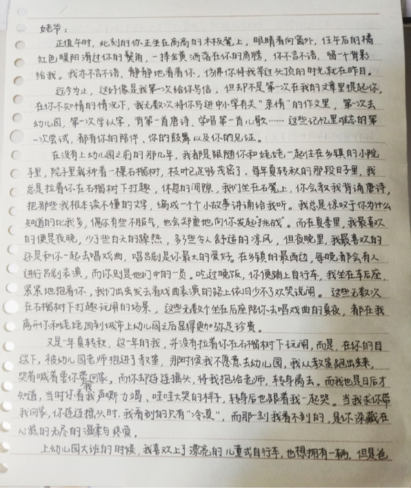 写给步履蹒跚的你:“难以忘记的,是无数个在石榴树下乘凉欢笑的夜晚,是在自行车后座抓紧姥爷衣襟的安心与喜悦”,财管182班程坤睿以“写给步履蹒跚的你”为题,用一篇小文章回顾了与姥爷二十年的相处历程。他说:“初春的和煦阳光里,夏夜的凉风里,嘈杂的戏院里,姥爷给我讲故事、唱戏曲的画面仍旧历历在目。”常年的求员工涯,程坤睿很少有像现在这样充裕的时间陪伴姥爷,而不经意间,光阴催人老,独自走路、高唱戏曲都已成为姥爷做不到的事情。“没关系,姥爷,我会牵着你的手,陪你走好每一步。”这是程坤睿对姥爷的承诺,而他也用这段宝贵的慢时光更深刻的体会了孝老爱亲的价值。