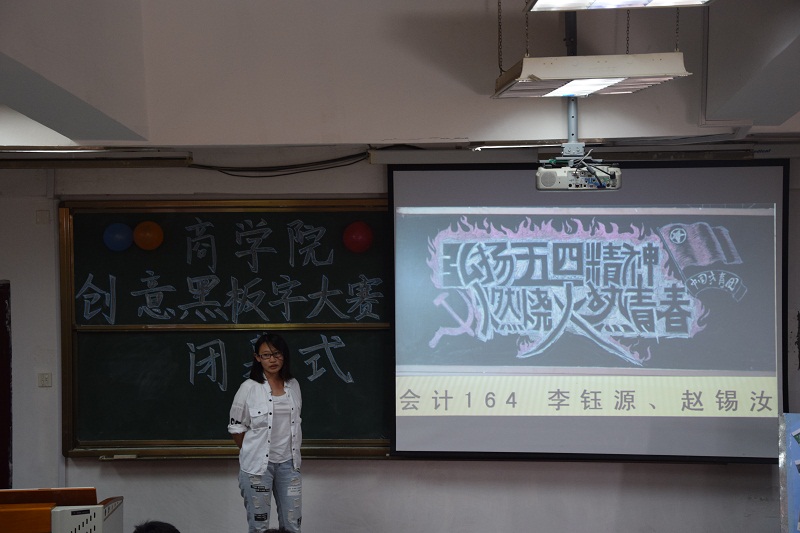 本次活动由beat365亚洲体育官方网站员工会宣传部主办,旨在纪念“五四运动98周年”与“中国共产主义青年团成立95周年”,大赛共收到参赛作品70余份。颁奖仪式上,大家首先观看了黑板字大赛成果视频展示,随后,主持人宣读了比赛结果,财管161班徐鹏旭等同学获得一等奖,会计163班时莹慧等同学获得二等奖,会计153班王军瑶等同学获奖三等奖,嘉宾为参赛选手颁奖。接着,获奖同学代表上台对自己的作品进行展示并介绍,发表获奖感言。通过观赏他人的黑板字作品,同学们加深了对五四精神的理解,从五四精神中感受到作为青年对国家的重要性和肩负着的责任。