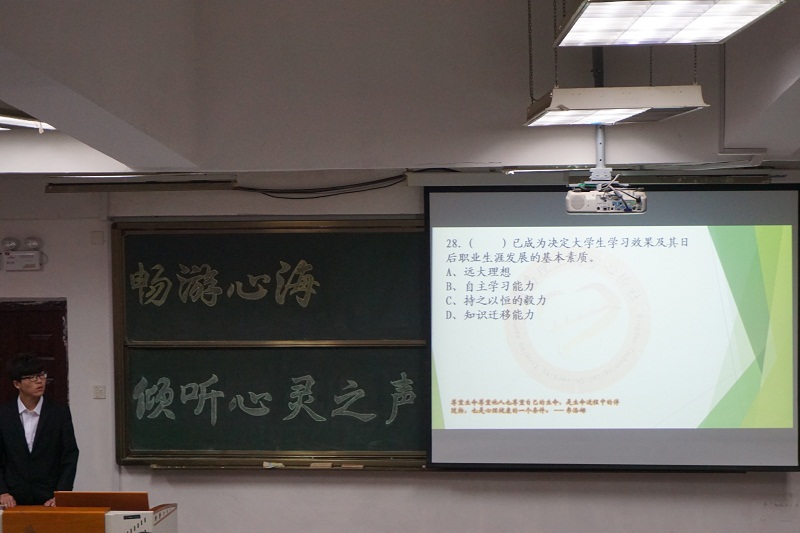 本次活动分为心理知识抢答和观影两个环节。参赛者以小组的形式进行单选、多选和论述题的抢答。抢答环节紧张而秩序井然,参赛者沉稳答题。随着抢答的进行,题目难度逐渐加大,竞争也越来越激烈。活动间隙,心桥社干事给大家带来的情歌对唱、诗朗诵缓解了竞赛紧张的气氛。论述题内容丰富,覆盖面广,从人际交往到恋爱观,还有如何科学地完善自我等问题,同学们也都各抒己见,积极阐述自己的观点。随后活动进行第二环节:观看心理影片《苍蝇的一分钟生命》。然后由同学们写下自己观影后最真实的感受。最后,主持人宣布比赛结果:第五组第三名,第一组第二名,第四组第一名,心桥社部长薛鑫为他们颁奖。至此,活动圆满结束。
