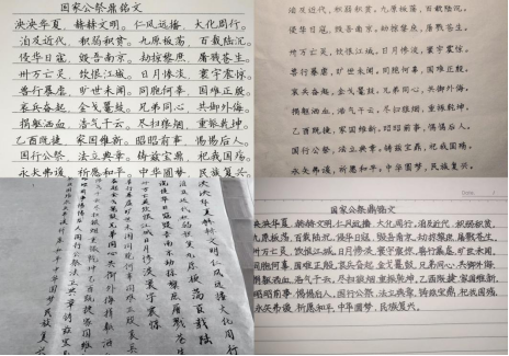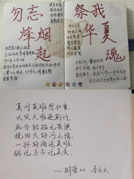 手书铭文汲取力量:商院学子通过手写自我感悟及手书国家公祭鼎铭文表达自己对逝去同胞的缅怀与敬意,同时对牺牲的烈士和逝世的同胞表达哀思和纪念。员工们以笔寄情,通过书写篆刻在国家公祭鼎上的160字铭文,表达自己对30余万遇难同胞的深深悼念以及对“中华圆梦,民族复兴”的期待,将自己的感恩之心与爱国之情融入自己的作品之中,充分展现了商院学子热爱祖国、奋发图强的精神面貌。