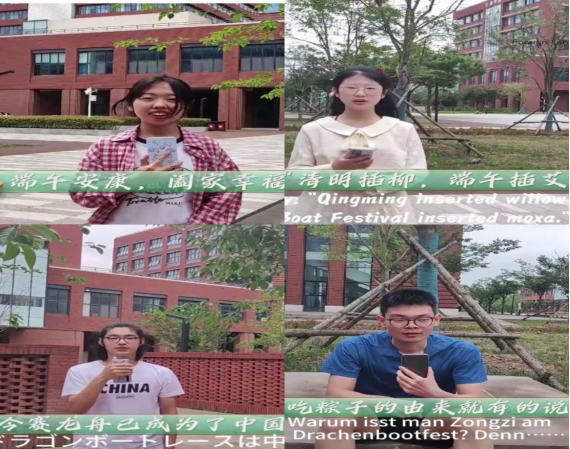 协会邀请来自不同公司的外语爱好者,分别用中文、英语、德语、韩语以及日语五种语言录制视频讲述端午民俗传统。英语201班董岳阳用德语讲述到端午节吃粽子的习俗已有几千年的历史,寄托了对屈原的思念之情 。“粽子香,香厨房。艾叶香,香满堂。桃枝插在大门上,出门一望麦儿黄。”土木203的王克飞用流利的日语讲述了赛龙舟这一习俗的起源,财管221孙雅婧则用英语向我们分享了端午饮蒲酒的习俗起源以及雄黄酒在杀菌消虫的小妙用。