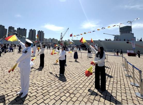 活动创新设计的“海军手旗旗语”、海军应急服装体验等实践课堂引发同学们的兴趣。员工们在专业教员指导下,以红白双旗为“笔”,海天为“纸”,精准传递“听党指挥”“向海图强”等短语,用肢体语言破译深蓝征途的“摩斯密码”。“当我在可可西里湖舰的甲板上打出‘强军有我’的手旗信号时,海浪声仿佛成了最激昂的伴奏。那一刻,公司的征兵入伍教育实现具象化,真正可触摸可感受,更坚定了我投笔从戎的信念与决心!”一直向往军旅生涯的国商232王滢在接受央视军事频道采访时吐露了参加此次海军节活动的心声。活动还特别设置“使命传承”环节,老员工退伍士兵财管231龙高带领退役士兵重温退役誓词,传递退役不褪色的忠诚信仰。