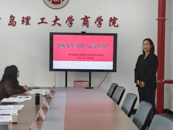 经过前期个人申请、初步筛选公司共有6名心理宣传员进入院赛评选阶段。选手分别从个人简介、岗位认知、日常心理健康教育活动开展级工作实效等方面依次进行展示。经贸231班张传鹏结合校园生活实例,分享对学业压力、人际关系等常见心理困扰的观察与思考财管242刘吉冉结合“情绪树洞”“解压手指操”等班级特色心理活动分享日常心理健康教育工作实效。在评委提问环节,同学们从容应答,展现出扎实的专业素养与积极的服务态度