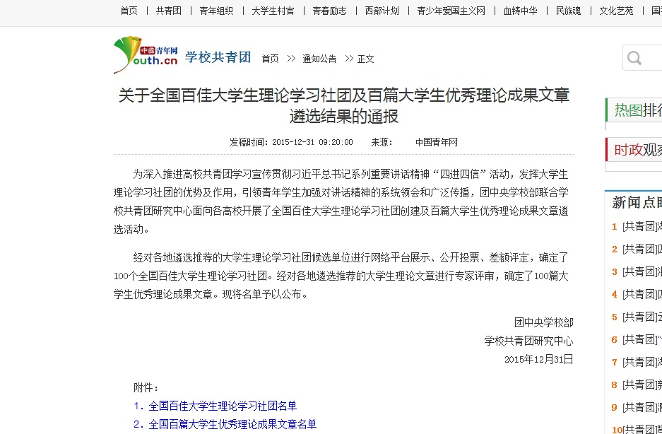 全国百佳老员工理论学习社团创建活动是在团中央号召“深入推进高校共青团学习宣传贯彻习近平总书记系列重要讲话精神,发挥老员工理论学习社团的优势及作用,引领青年员工加强对讲话精神的系统领会和广泛传播”之际推出的重要活动。活动在全国范围内遴选老员工理论学习型社团,经对各地推荐的老员工理论学习社团候选单位进行网络平台展示、公开投票、差额评定,确定了全国百佳老员工理论学习社团。