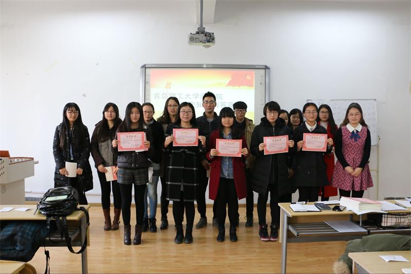本次知识竞赛内容涉及社会主义核心价值观相关内容,党的十八大、十八届三中、四中、五中全会精神,以及党史的基本知识,并采用文字、图片等多种形式进行试题展现。活动共分为必答题、选答题和红色经典猜猜猜三个环节。在整个比赛中,各组选手准备充分,团结协作,竞赛场面紧张而又不失活泼热烈。经过激烈的角逐,最终由徐铭阳光队和刘叶子逐梦队荣获一等奖,李晓丹起航队等三队选手荣获二等奖,张婧仪扬帆队等五队选手荣获三等奖。