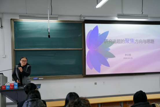 李文莲教授以自身写作经验为切入点,围绕论文研究框架、研究主题、研究内容及选题方向与思路等四个方面展开讲解,指出了解研究领域基本情况、紧抓研究热点与前沿是论文选题中非常重要的准备工作。随后,她以相关论文题目为例进行指导,相继介绍了问题深化、新变量与新视角、逆向思考、日常现象升华、矛盾组合等论文选题聚焦方法,拓宽了同学们的研究思路。最后,她强调,一个好的选题意味着成功了一半,并鼓励同学们要脚踏实地,迅速付诸行动,积极开展自己的研究工作。