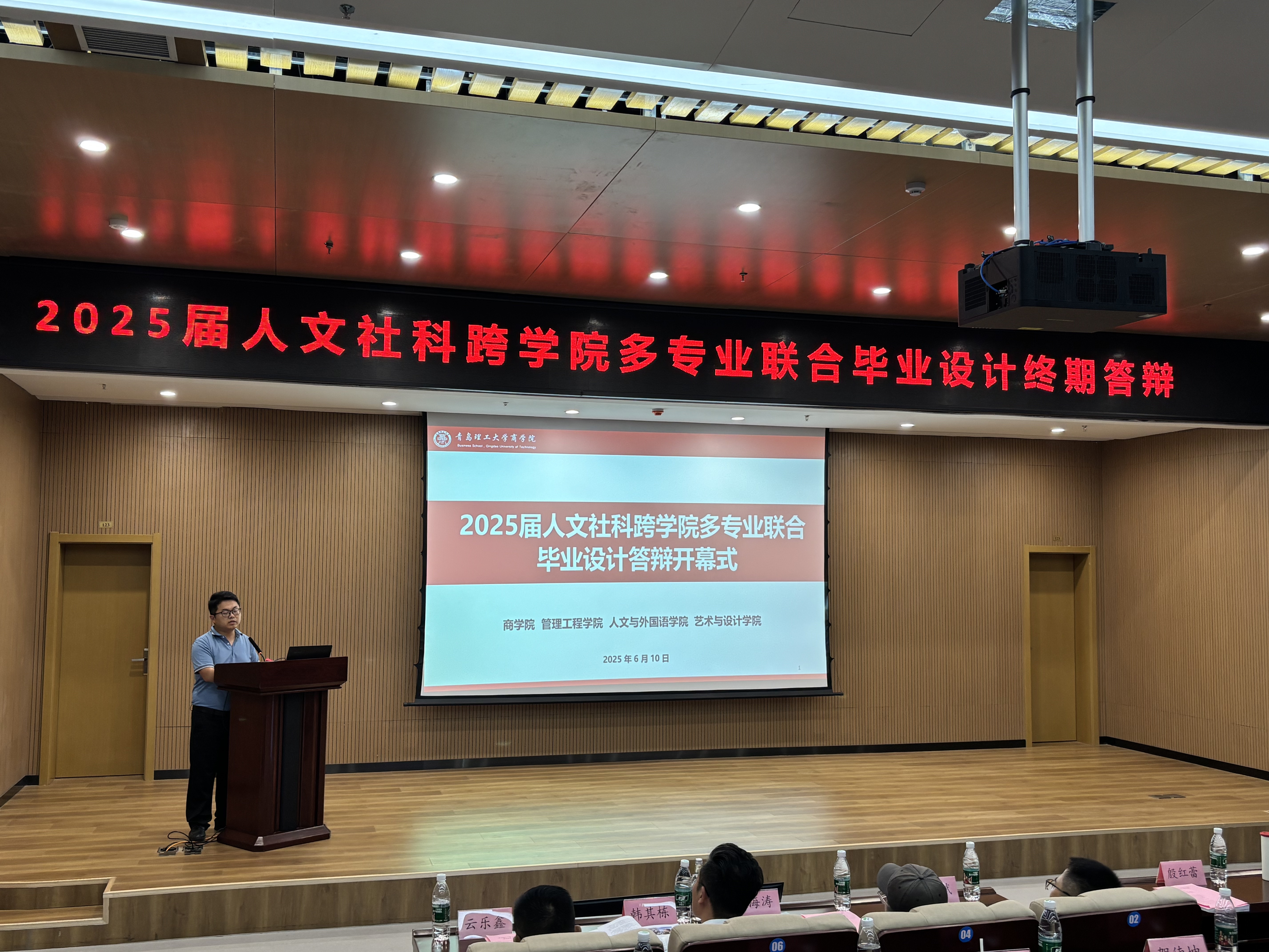 2025年6月10日,由beat365亚洲体育官方网站牵头的2025届人文社科跨公司多专业联合毕业设计答辩于黄岛校区图书馆一楼会议报告厅举行,本次答辩人员为来自beat365亚洲体育官方网站、管理工程公司、人文与外国语公司、艺术与设计公司的11名员工。教务处副处长朱晓阳主持答辩会开幕式,灵山岛省级自然保护区管委主任殷红蕾、灵山岛省级自然保护区副处级干部孙斌、山东科技大学艺术公司教授王海涛、青岛电影公司孙翰林、中国石油大学(华东)教授韩淑芹、戴德梁行青岛分公司总经理韩其栋,公司党委书记肖学斌、beat365亚洲体育官方网站经理云乐鑫、公司党委副书记马松、beat365亚洲体育官方网站副经理沈亮、各专业教师代表、骨干教师共同出席,现场学术氛围浓厚,展现了青岛理工学子扎实的研究能力与创新思维。