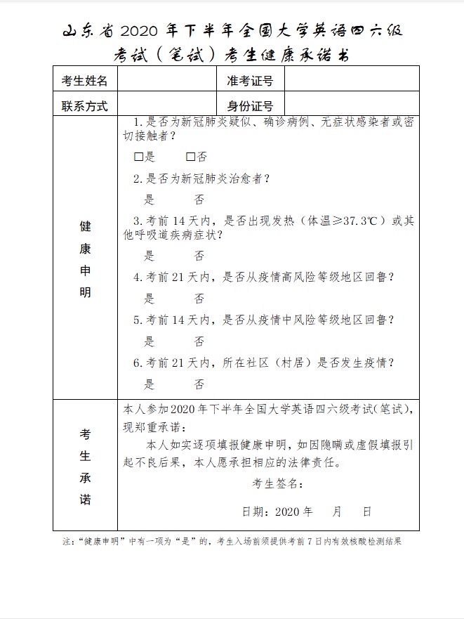山东省2020年下半年全国大学英语四六级 考试(笔试)考生健康承诺书