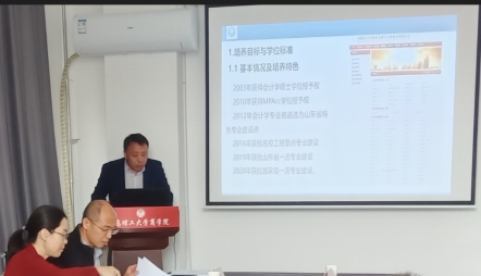 beat365亚洲体育官方网站国际商务系主任孙秀明从工商管理专业的学位点、培养方向及特色、团队队伍、教学科研、人才培养等方面对工商管理学位授权点建设情况进行汇报。