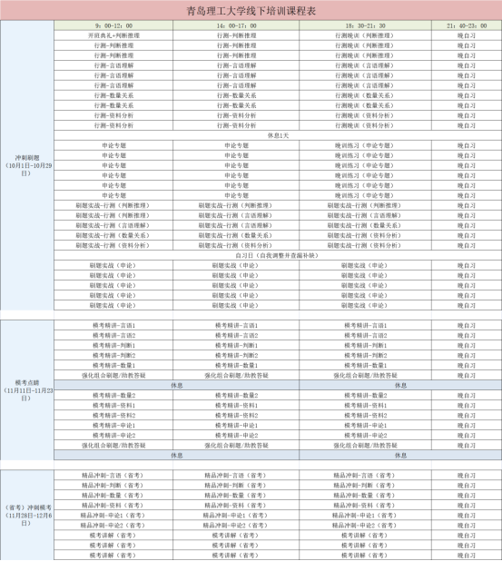 本次培训线下授课时长为49天49晚,线上时长为276小时,线下授课时间为上午9:00-12:00,下午14:00-17:00,晚上18:30-21:30。培训内容涵盖了行测(文/理)和申论两个方面,包括基础精讲、系统强化、冲刺刷题、模拟点睛,省考冲刺模拟等五个阶段,具体课程安排如下表: