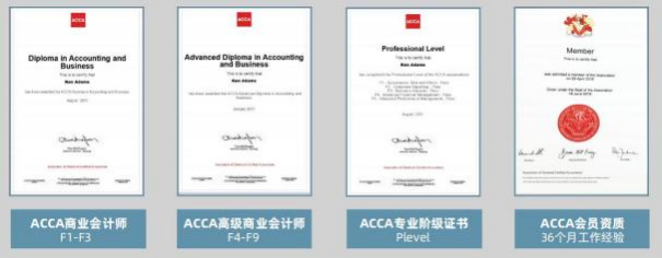 ①ACCA阶段证书(商业会计团队格证、高级商业会计团队格证、ACCA专业阶段证书、ACCA会员)共计4张专业资质证书。