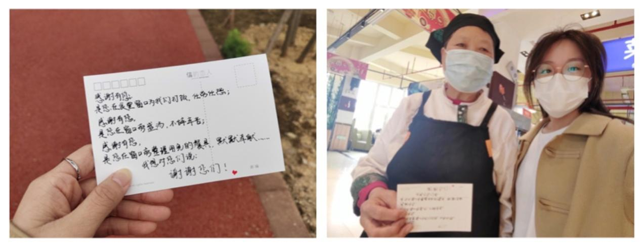 在疫情防控常态化的形势下,医务人员不辞辛劳,坚持每日核酸检测工作,为师生营造安全可靠的校园环境,财管201雷晓宇为一位位逆行者送上祝福:“春风送暖,欣欣向荣。万物复苏,旧疾当愈。待到河清海晏,相逢国泰民安。”经济211卢浩在卡片上写道:“三尺讲台,三寸舌,三寸笔,三千桃李;十年树木,十载风,十载雨,十万栋梁。”表达了对三尺讲台上的老师致以真挚的敬意。