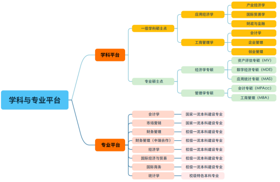 公司现有应用经济学、工商管理学两个硕士学位授权一级学科,设有应用经济学、工商管理学2个学术硕士授权专业,并有会计专硕(MPAcc)、应用统计专硕(MAS)、资产评估专硕(MV)、数字经济专硕(MDE)和工商管理(MBA)5个硕士授权专业。同时,设有7个本科专业,分别是会计学、市场营销、财务管理、经济学、国际经济与贸易、国际商务、统计学。其中,财务管理专业包括财务管理普通本科专业和财务管理中瑞国际合作本科专业。